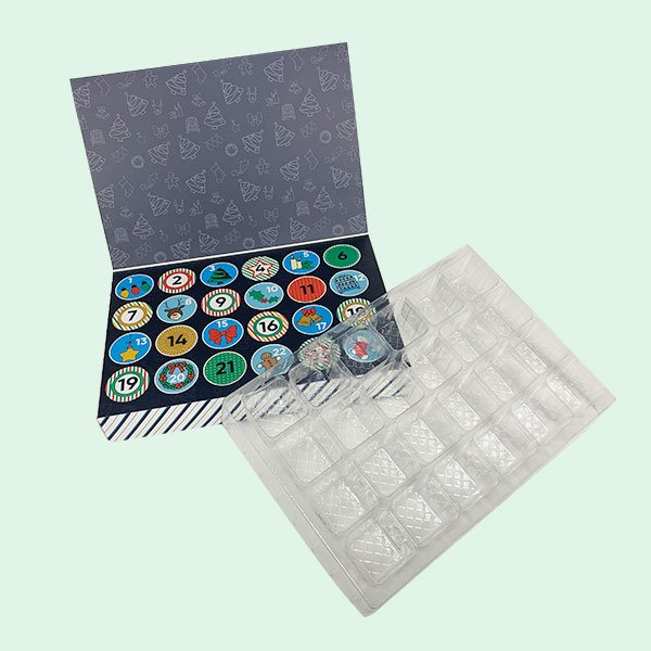 Transparent blister tray used inside the box. Built to your chocolate’s shape.