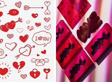 - Key design cues: heart shapes, shades of red and pink, elegant typography, rose gold accents.