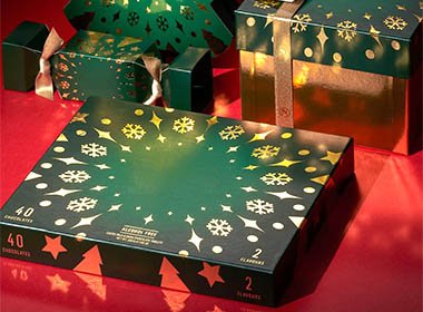 Let’s look at how chocolate brands can bring festive packaging to life through thoughtful design and product presentation. While some go bold with elaborate prints and structures, others win with subtle, elegant touches.